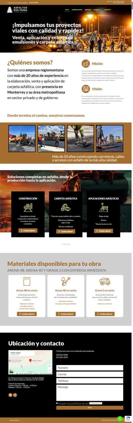 El resultado fue una página enfocada en la conversión y posicionamiento, con un diseño contemporáneo que transmite seriedad y confianza. La landing actúa como carta de presentación digital, permitiendo que Asfaltos Sultana llegue a nuevos clientes y consolide su reputación en el mercado..